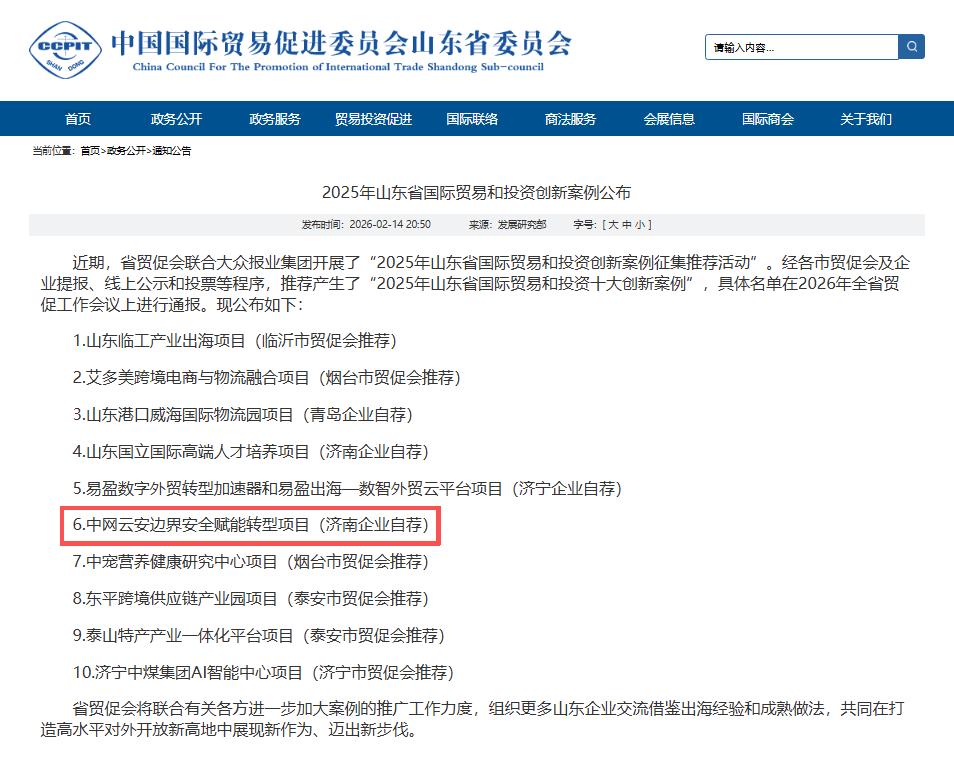 近日,由中国国际贸易促进委员会山东省委员会(以下简称:省贸促会)联合大众报业集团共同发起的“2025年山东省国际贸易和投资创新案例征集推荐活动”结果正式揭晓。经过各市贸促会推荐、线上公示、公众投票等多轮严格评审,悟空体育——边界安全赋能转型项目,凭借其卓越的技术创新能力与国际化发展成果,成功入选“2025年山东省国际贸易和投资十大创新案例”!